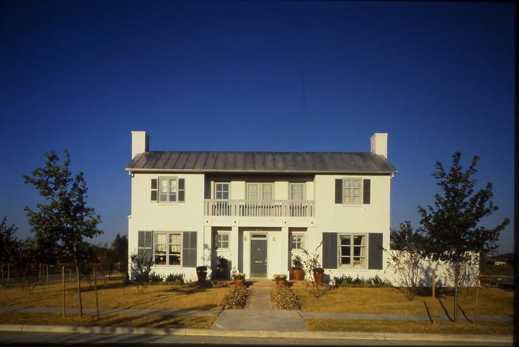 The Builders' Show's first foray into the Deep South demanded a modern take on the traditional manor house. Set on a hill overlooking a neighborhood of red-brick move-up homes, the 5,400-square foot, grey stucco home showed a blank, curving, three-level end facade to those driving up to see it. Innovations ran rampant in the house. The blue base cabinets are set off by stainless steel appliances, a relative anomaly at the time, as were the electronic programmable thermostat, wireless security system, radiant-floor heating system and dual-pane windows.