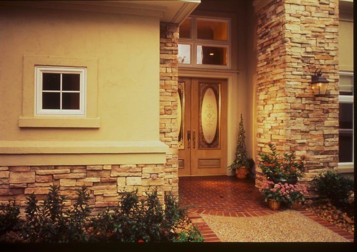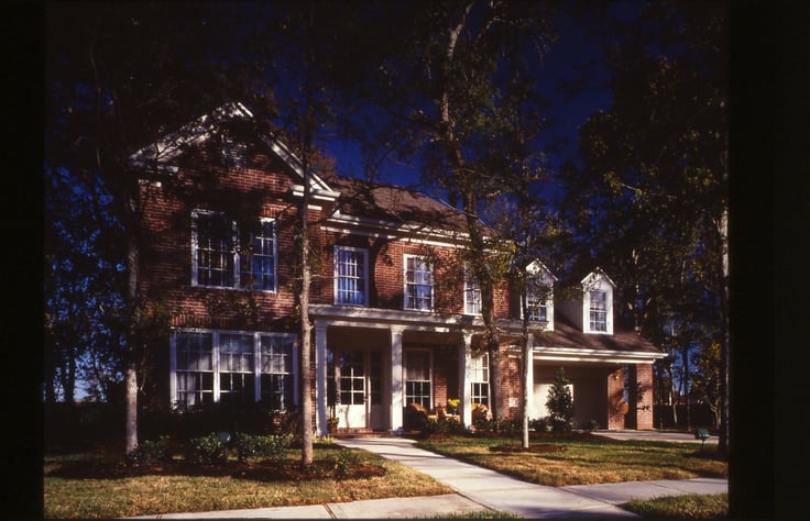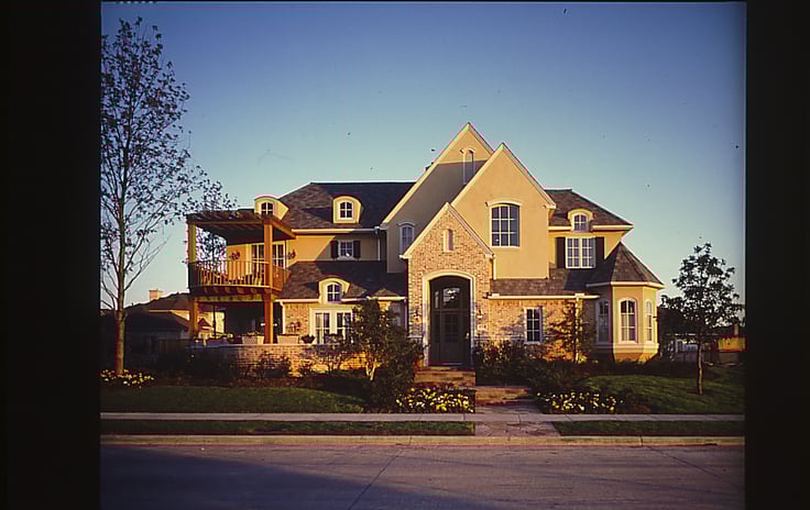 A custom take on a production house, the 1999 TNAH brought a variety of ideas to bring style and convenience to the move-up family market. Combining an attractive stone and brick exterior with recessed garage doors set behind a colonnade that extended to the courtyard entry, the house upped the ante of suburban curb appeal. The diagonal floor plan was equally dramatic yet also smart; it was essentially a rectangle turned to the side, with only a few odd angles and an open floor plan.