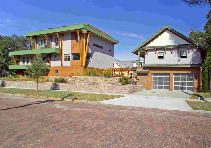 The program's legacy of innovative design, lifestyle and resource efficiency culminated in 2007 with a high-performance contemporary Craftsman-style house positioned on a prime corner lot that afforded a glimpse of the city's signature feature, Lake Eola. The home's true value was in its performance features. A system of insulated, precast concrete panel shell and floor system anchors the house, topped by a green roof containing an array of photovoltaic panels to offset the utility grid. The insulated windows featured an exterior coating that resists dirt and dust, while the stucco cladding offered a treatment to block pollutants.