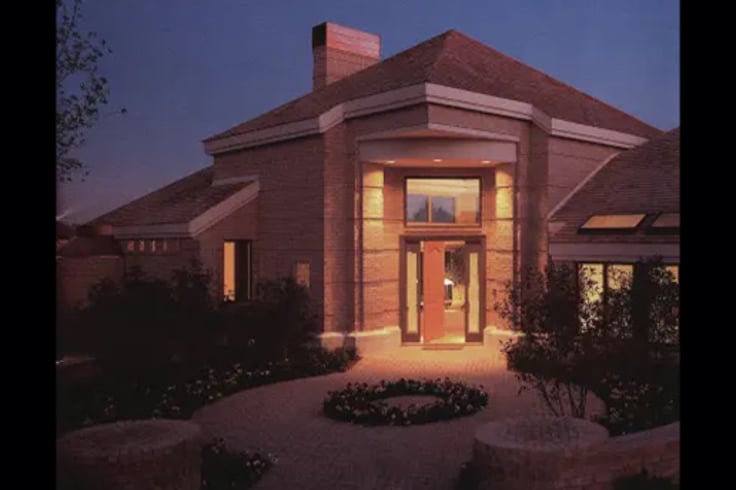 The 1987 house made a dedicated effort to attract empty nesters with a well-appointed, contemporary approach. Angled to the street and revealing little behind its facade except a long peaked roof to the back, the 3,600-square foot, single-level plan features only two bedrooms. The 1987 house was ahead of its time technologically. A whole-house audio system, remote security monitors and a two-line phone scheme that enabled multiple communications functions were precursors to today's structured wiring schemes.