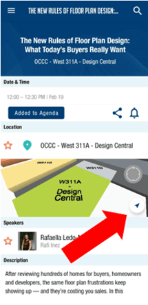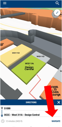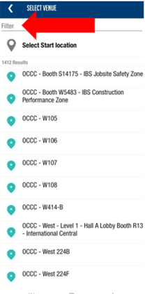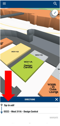 Tap tap to edit to bring up a list of locations and select your starting point or tap Filter in the upper left of the screen to enter the name or room/booth number. Once you select the location in the lower left you will see how long it will take to get to the destination. Tap Navigate and follow the routing instructions.